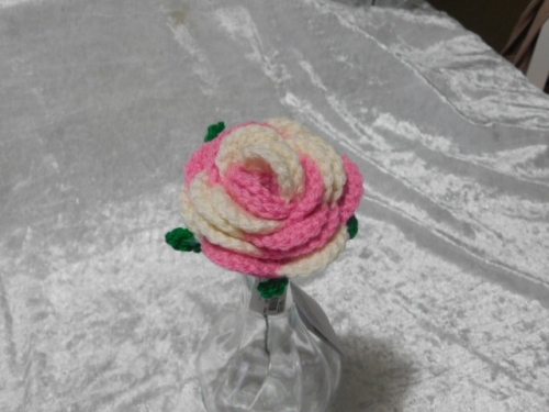 Single crochet rose measuring approx. 9cm across x 27cm long. Vase not included.