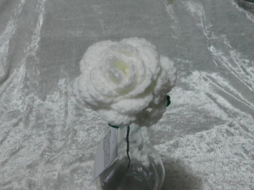 Single crochet rose measuring approx. 9cm across x 27cm long. Vase not included.